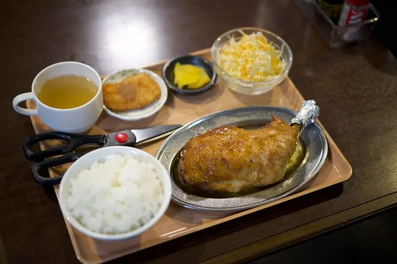 主菜に骨付き鶏を据えた定食を舞鶴で